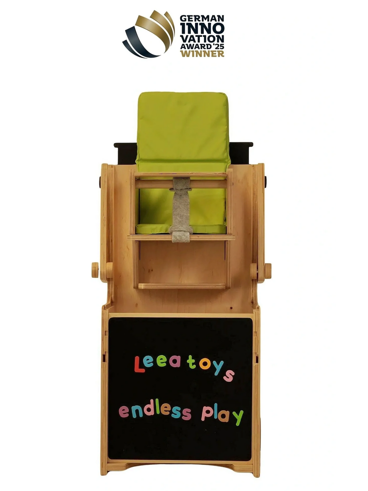 Mit die Leea Abenteuer-ecke hast du essentielle Möbelstücke für dein Kind: Mini-Schreibtisch, Hochstuhl, Lernturm. Du kannst sie nicht alle gleichzeitig benutzen. Viel besser ist es, sie ineinander zu verwandeln – wir haben uns bemüht, es ganz einfach zu machen! So sparst du Platz und Geld.